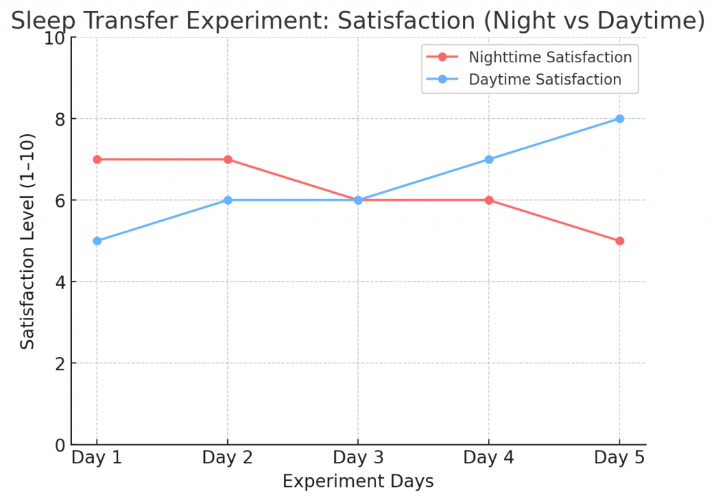 This tested whether satisfaction could be moved from night to day, revealing the emotional and symbolic meaning of the night. Participants consistently told me: