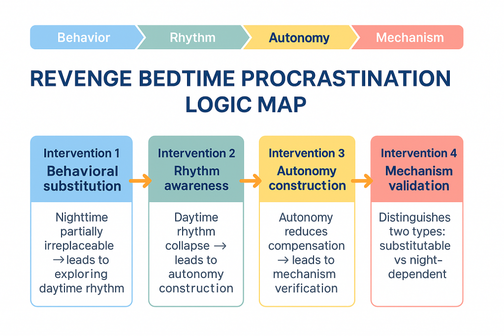Explain psychological mechanisms of Revenge Bedtime Procrastination; test whether daytime autonomy and rhythm reconstruction reduce Revenge Bedtime Procrastination.